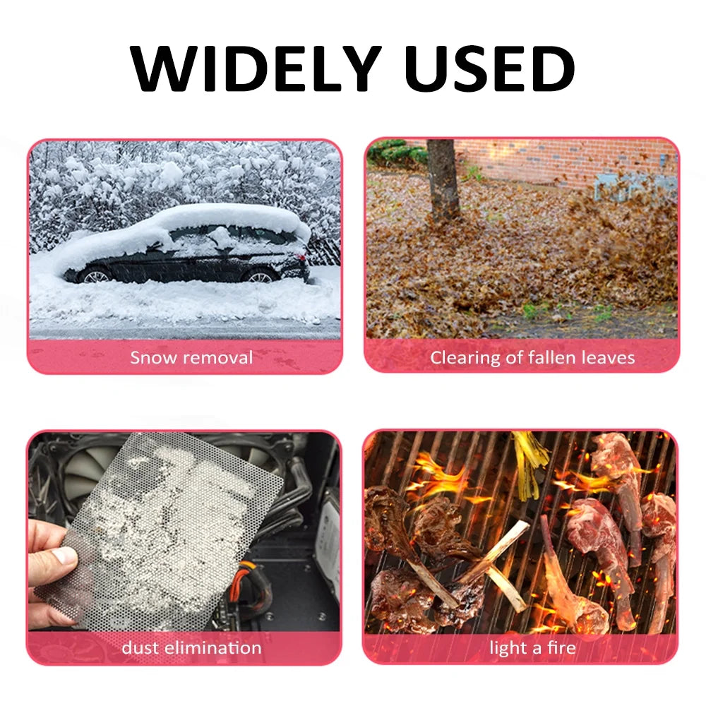We offer two options, cost-effective and professional versions. In addition to drying the water and snow on the car surface, it can also help blow the charcoal fire of the barbecue. A professional version uses a brushless motor, which has stronger wind power and longer life, and can blow away snow covering the car up to 10cm thick.